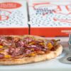 salsa tomate, pollo, shitake, bacon, pimientos, cebolla, maíz, mozzarella, salsa barbacoa